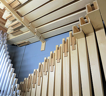 Die Orgel der ev. Kirche zu Caputh wird unter teilweiser Verwendung des historisch gewachsenen Pfeifenbestandes aus dem Instrument von Carl Ludwig Gesell aus dem Jahr 1852 und aus der Orgel von Alexander Schuke aus dem Jahr 1926 neu gebaut. Anstelle der pneumatischen Orgelanlage von 1926 entsteht eine mechanische Schleifladenorgel mit 20 Registern. Der historische Prospekt von 1852 wird beibehalten. Die obigen Bilder zeigen den Stand der Orgelrestaurierung / Erneuerung vom 4. Januer 2004 sowie unsere Mitarbeiter Michael Treblin und Daniel Gatzsche bei der Arbeit an der Caputher Orgel.